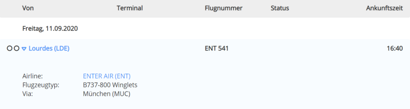 13.09.20 18:00 LDE- via MUC-CGN ENT541 Boeing B737-800